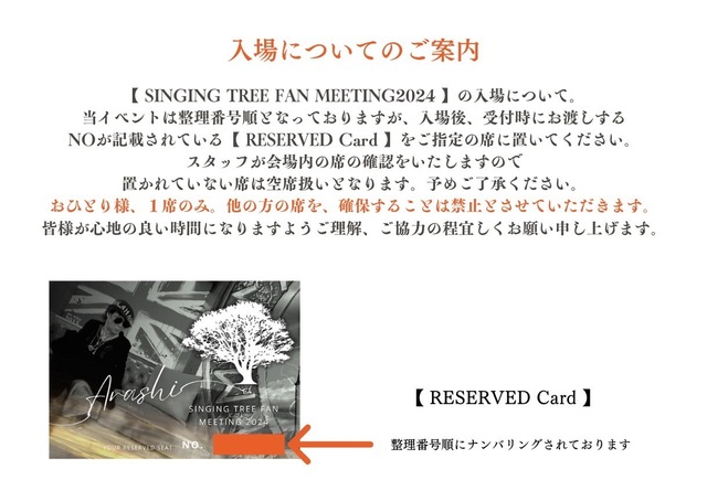 ご入場時に「RESERVED Card」をお渡ししますので、ご自身の席に置いてください。
